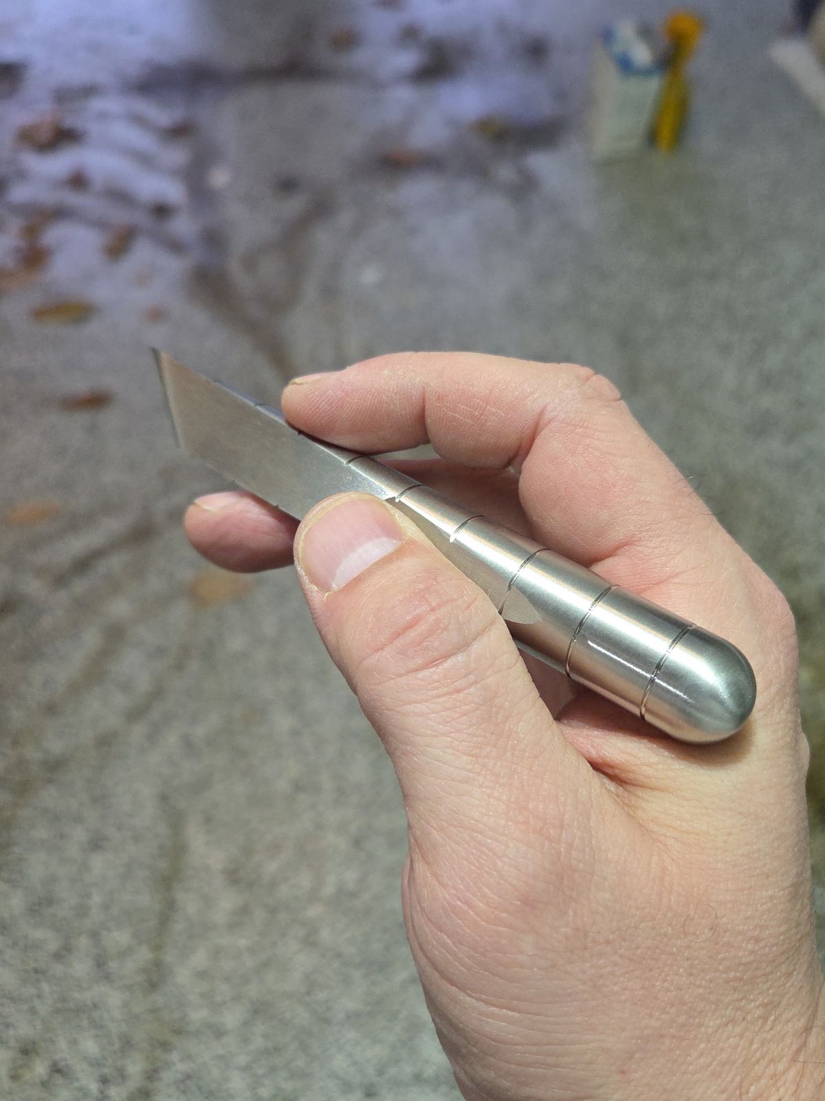 A multipurpose cutting tool intended to live on your desk, always within reach. Inspired by the Japanese kiridashi knife, but recontextualized for the contemporary workspace, the Desk Knife is elemental and satisfying to use. Learn more about the development of the Desk Knife here. Looking for a refined home for the Desk Knife? Consider the Desk Knife Plinth.