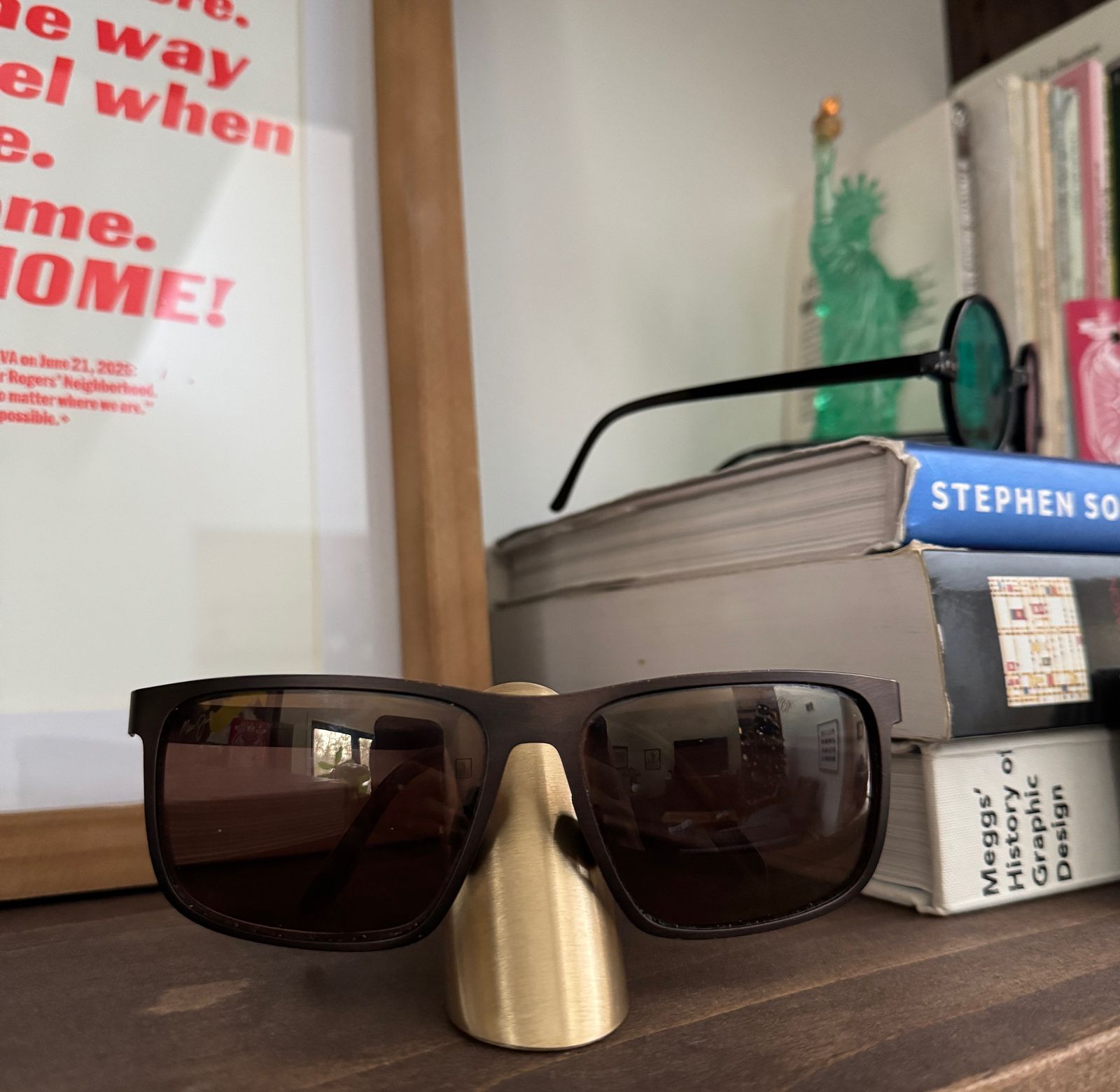 The Eyewear Stand accommodates any style of frame, and glasses almost appear to be leaning back, fully reclined. A distinct face-like quality emerges — a museum moment with a faint whiff of Groucho Marx.
